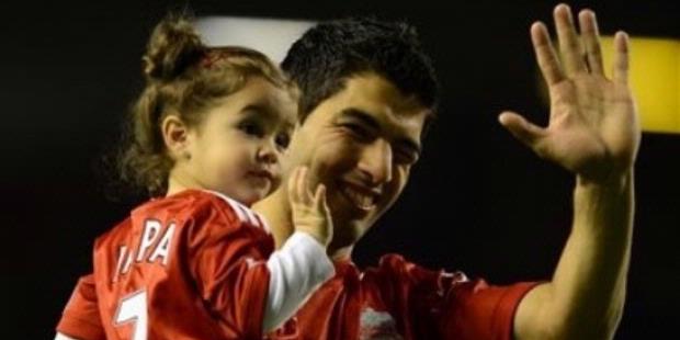 Pemain Liverpool, Luis Suarez, melambaikan tangannya kepada para suporter dari lapangan bersama anak perempuannya setelah timnya menang 4-1 atas Chelsea di laga lanjutan Premier League di Stadion Anfield, Liverpool, Selasa (8/5/2012).